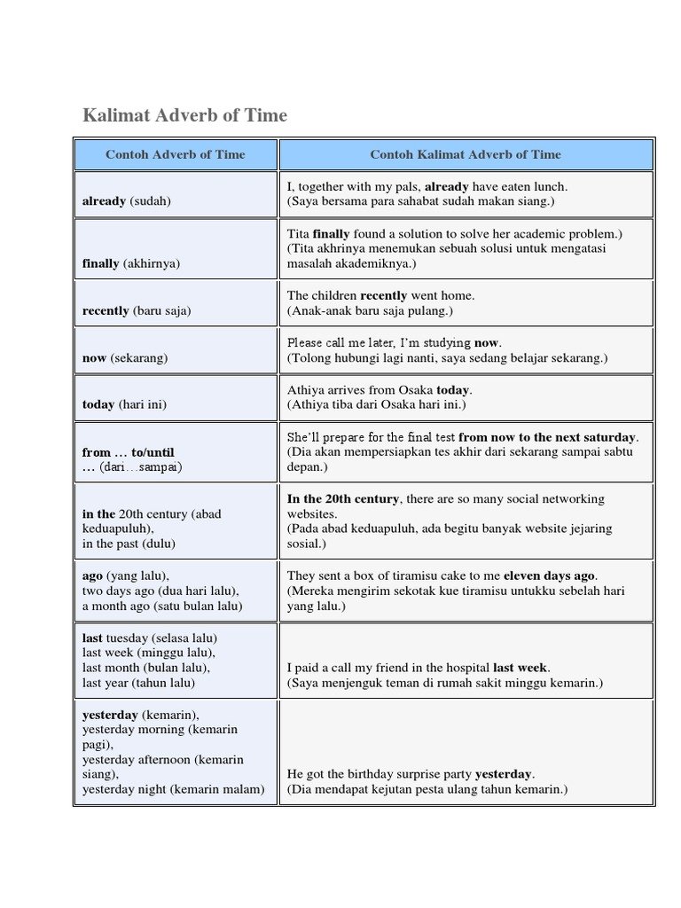 Pengertian, contoh kalimat, dan contoh soalnya dalam bahasa inggris hai sobat ibi semua? Kata hubung yang sering digunakan untuk jenis adverb clause ini antara lain: Nah, admin rasa sahabat sbi sudah paham bukan mengenai materi tersebut? Adverbial clause digolongkan menjadi 10, yaitu. I waited in the mtr station until the train. The recruitment process moved so slowly. Adverb of time adalah adverb (kata keterangan) yang digunakan untuk menyatakan waktu terjadinya suatu kegiatan atau peristiwa. Adverb (kata keterangan) memiliki empat jenis, yaitu adverb of manner, adverb of place, adverb of time, dan adverb of frequency. 20 soal dan jawaban preposition. Adverb of manner (kata keterangan cara) adverb of manner (kata keterangan cara) ini berfungsi untuk menjelaskan cara suatu aksi dilakukan, contohnya slowly, beautifully, fast, shyly dan sebagainya. Maka, kita harus bisa menempatkan kata tersebut agar sesuai dengan maksudnya dalam sebuah kalimat. Namun, bila kalimatnya panjang, adverbia waktu dapat diletakkan di bagian awal kalimat. (yusuf jarang mencuci sepeda motornya).