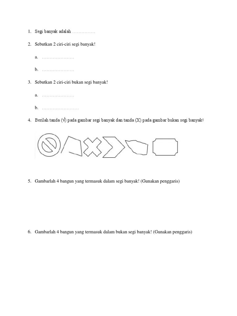 Join live classes at colearn . Materi kelas 4 · 1. Di lihat dari bentuk bangunnya, bangun segi banyak beraturan memiliki ciri ciri antara lain: • pokok bahasan segi banyak kali. Gambarkan dua bangun datar segi banyak sebanyak 2! Salah satu ciri bangun segibanyak tidak beraturan adalah. Ayah memiliki kawat sepanjang 210cm ayah ingin . Memiliki sisi yang sama panjang b. Gambar segi banyak dan bukan segi banyak :